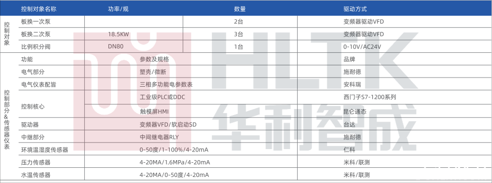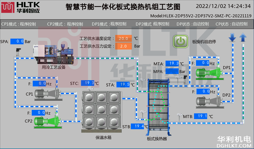 控制水泵的頻率控制流量和溫度,從而實(shí)現(xiàn)板式換熱器的二次側(cè)熱流體的精準(zhǔn)溫度自動(dòng)控制。