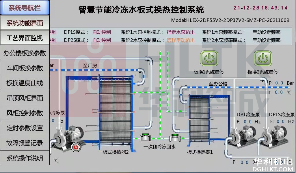 控制系統(tǒng):控制系統(tǒng)通過PLC控制器和控制軟件,用于監(jiān)測(cè)板式換熱器二次側(cè)的冷凍水進(jìn)出口溫度給定一次側(cè)水泵的運(yùn)行頻率,通過